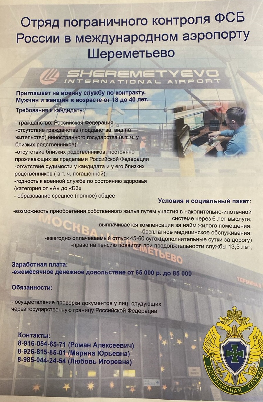 Отряд пограничного контроля ФСБ России в международном аэропорту Шереметьево приглашает на военную службу по контракту.
