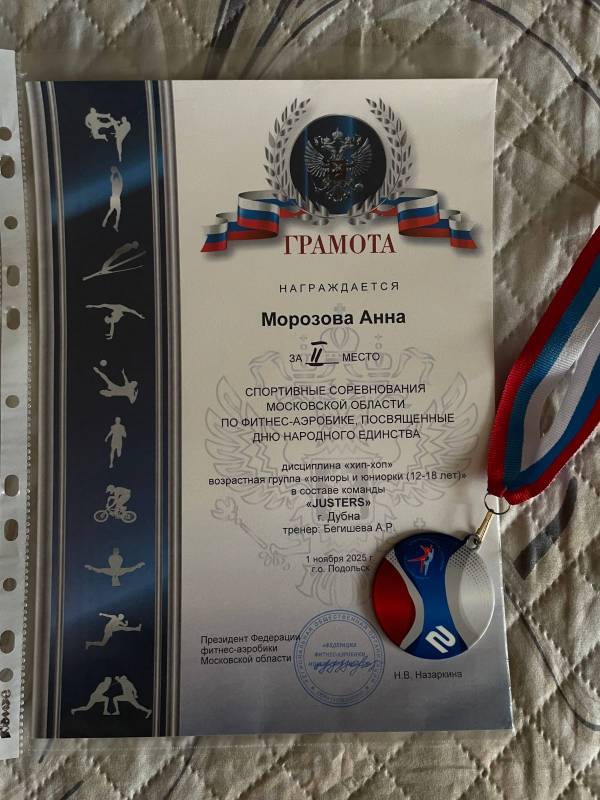 Студентка 1 курса Морозова Анна (специальность «Правоохранительная деятельность») привезла очередную награду из города Подольск. Команда «JUSTERS» заняла 2-е место в спортивных соревнованиях Московской области по фитнес-аэробике, посвященных Дню народного единства.
