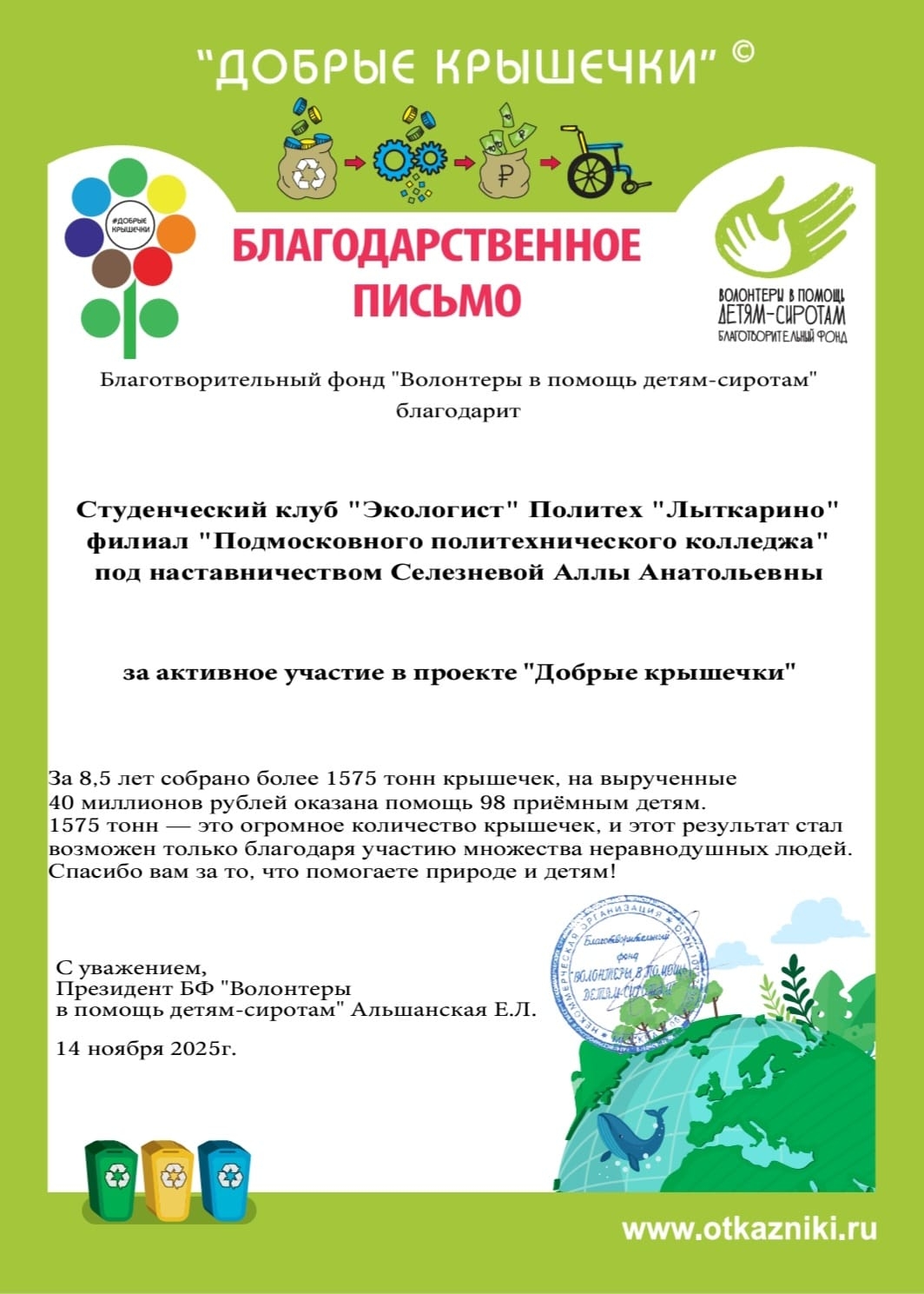 Вклад студентов и педагога Политеха «Лыткарино» в общее дело по вторичной переработке отмечен Благодарственным письмом Президента благотворительного фонда «Волонтеры в помощь детям-сиротам».