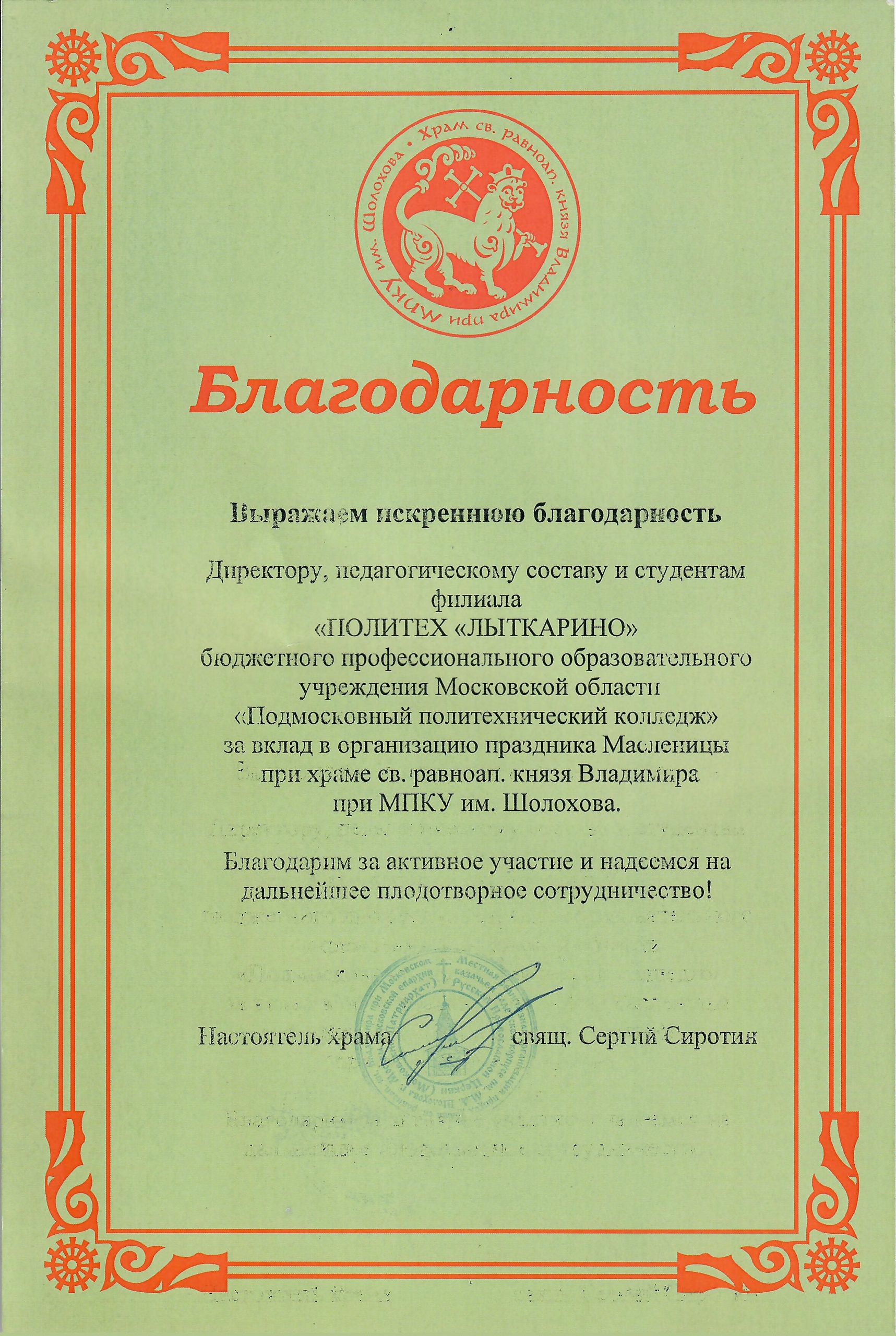 За волонтёрскую помощь при проведении праздника Масленицы на территории Церкви Владимира Равноапостольного при Московском казачьем кадетском корпусе им. М.А. Шолохова преподаватели и студенты Политеха «Лыткарино» отмечены благодарностями настоятеля Храма Сергия Сиротина.