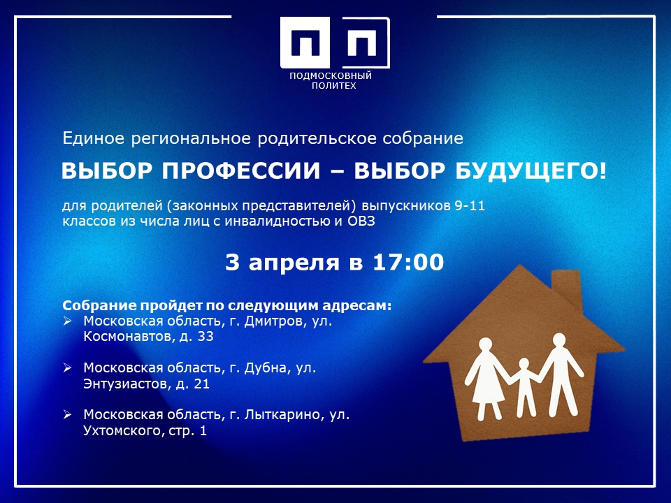 Подмосковный политех приглашает вас на Единое региональное родительское собрание по теме «Выбор профессии — выбор будущего». Мероприятие проводится для родителей (законных представителей) выпускников 9-11 классов из числа лиц с инвалидностью
